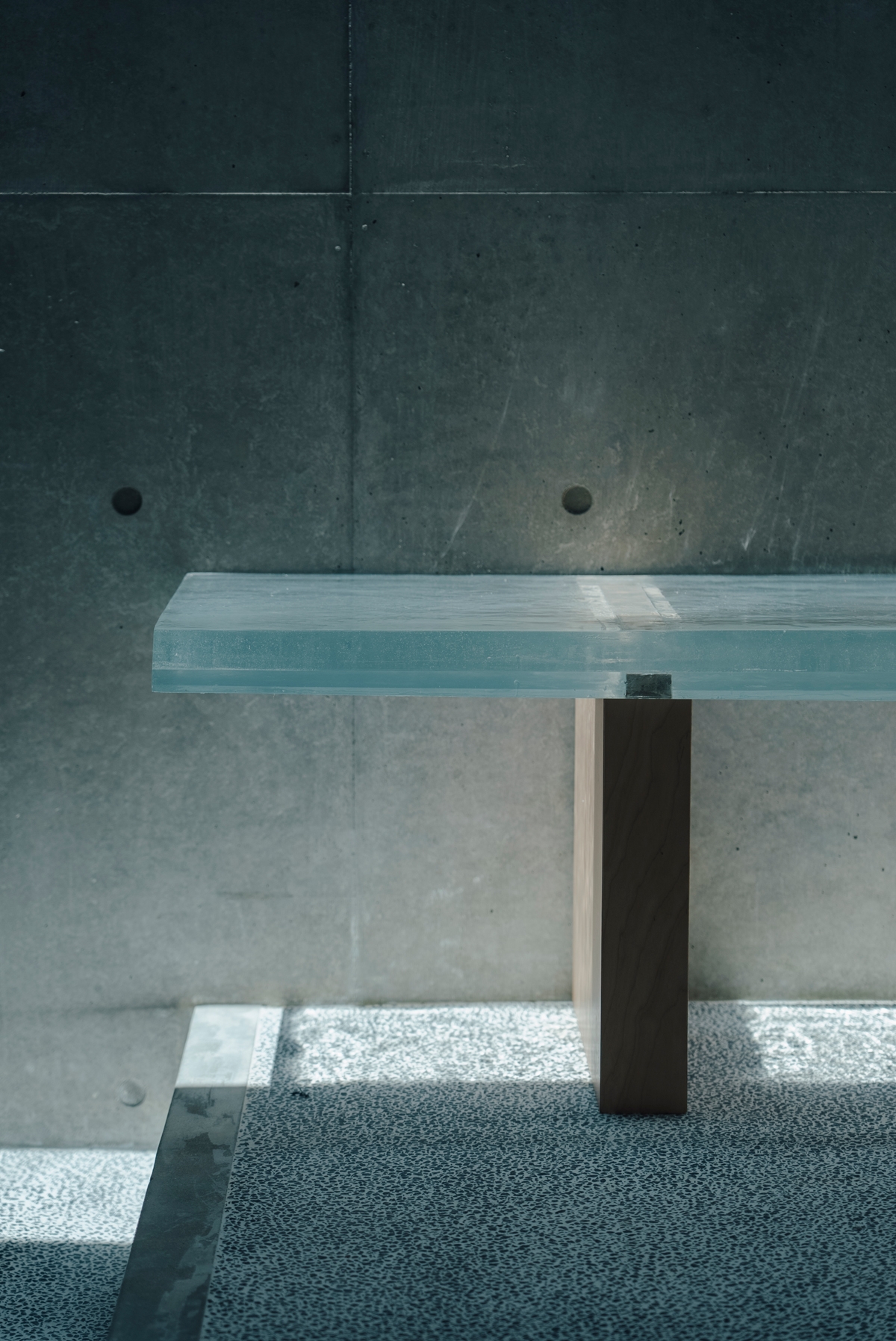 エントランスのアクリルベンチが一瞬の光を受け止めるとき、空間は時間を感じさせる聖域のような佇まいを見せる。